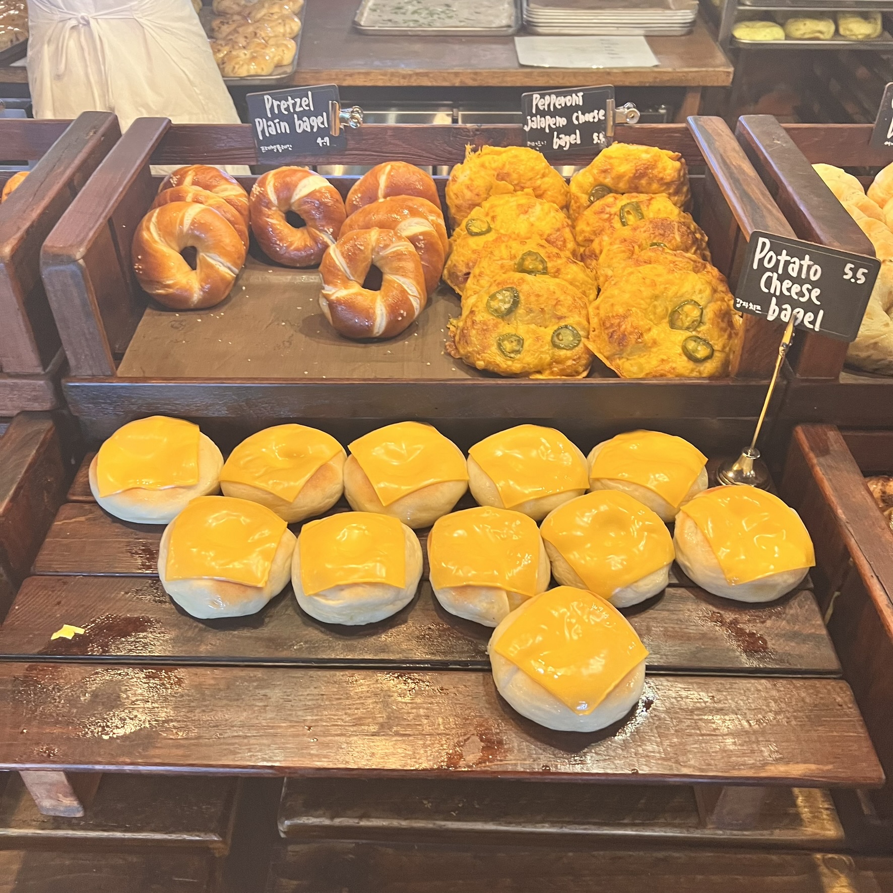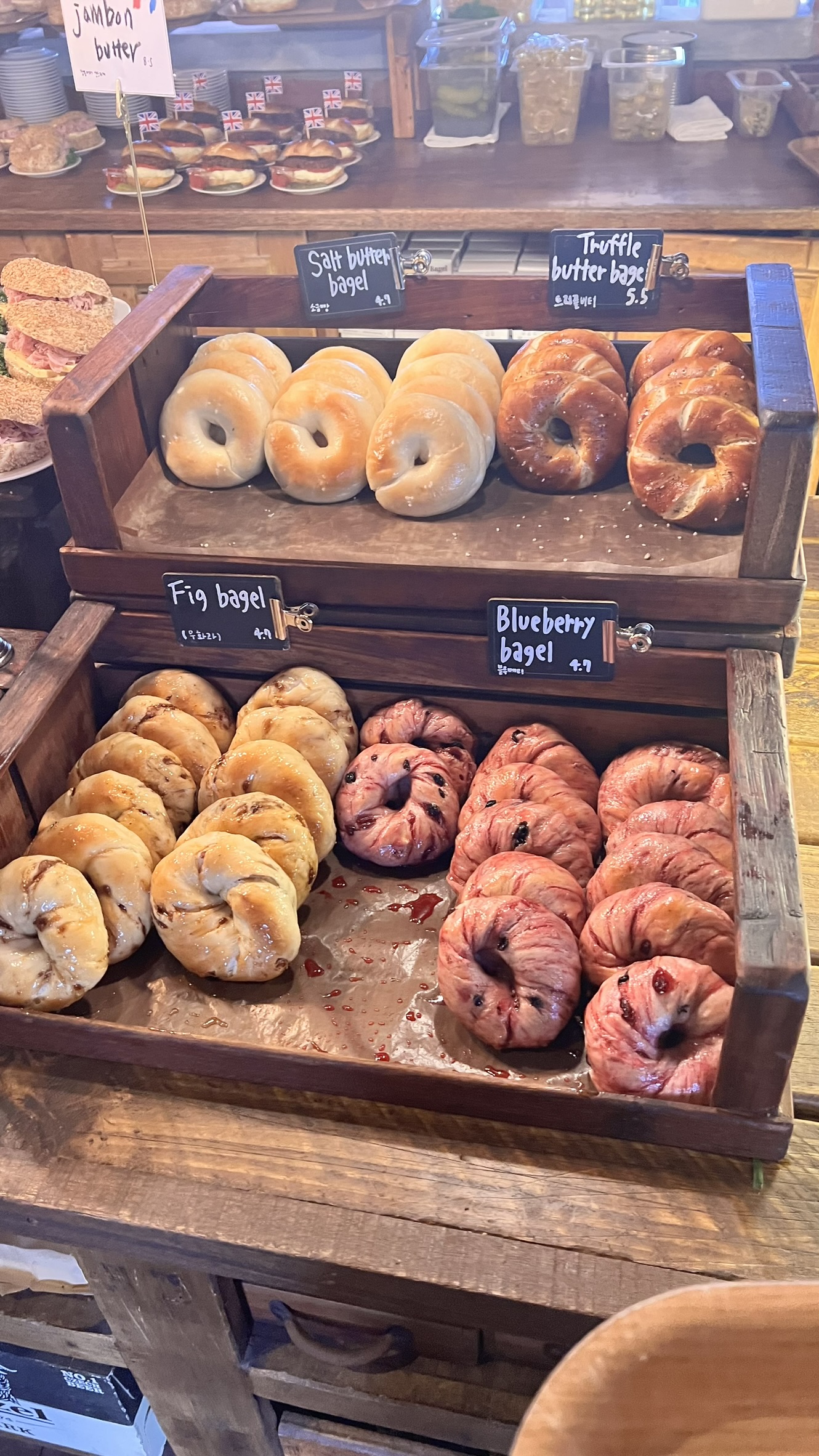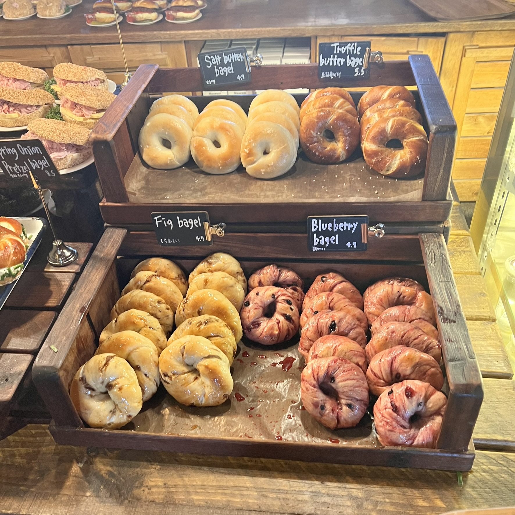 플레인부터 시작해서 정말 다양한 종류의 베이글이 존재합니다. 미리 자신이 먹을 베이글을 골라서 가시는 걸 추천드립니다. 안에서 고르기엔 사람들이 계속 들어오기 때문에 놓칠 수가 있습니다.