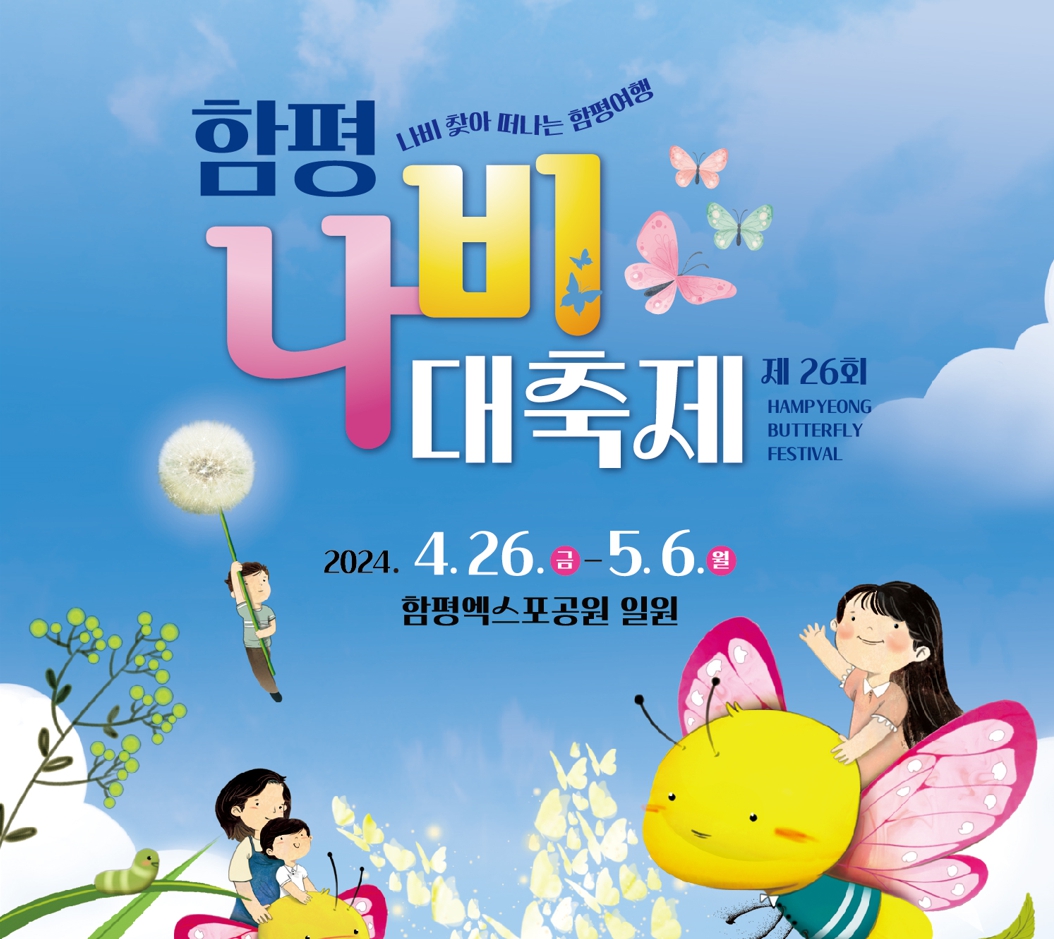 나비를 찾아 떠나는 함평여행이 주제인 제 26회 함평 나비대축제는 함평군에서 주최하고 (재)함평축제관광재단에서 주관하는 행사입니다. 4월 25일까지 사전예약으로 10% 할인받고 4월에 피는 다양한 꽃들과 날개짓이 아름다운 나비들을 관람하실 수 있으니 잊지 말고 챙기셔서 보다 즐거운 시간 보내시기 바랍니다.
