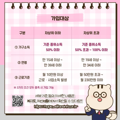 - 신청방법 : [자산형성포털 - 청년모여樂] 게시물 참고하여 해당 광역자활센터로 문의